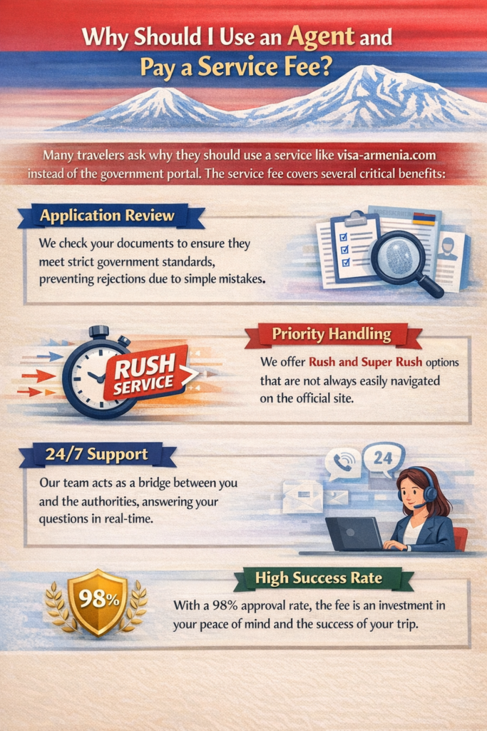 Many travelers ask why they should use a service like visa-armenia.com instead of the government portal. The service fee covers several critical benefits:
